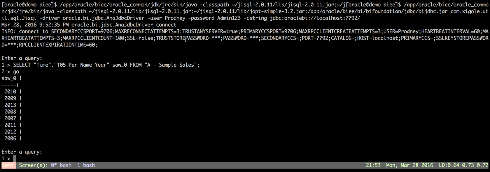 [oracle@obieesampleapp jisql-2.0.11]$ ~/obiee/Oracle_BI1/jdk/bin/java -classpath lib/jisql-2.0.11.jar:lib/jopt-simple-3.2.jar:lib/javacsv.jar:/home/oracle/obiee/Oracle_BI1/bifoundation/jdbc/bijdbc.jar com.xigole.util.sql.Jisql -user Prodney -password Admin123 -driver oracle.bi.jdbc.AnaJdbcDriver -driverinfo -debug -cstring jdbc:oraclebi://obieesampleapp:9703/