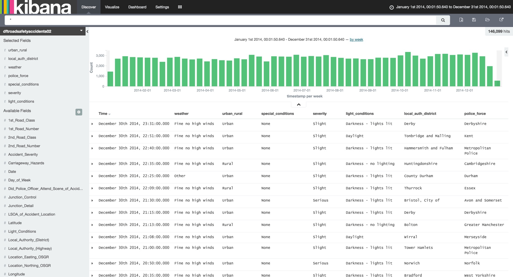 Kibana is a tool from Elastic that makes analysis of data held in Elasticsearch really easy and very powerful. Because Elasticsearch has very loose schema that can evolve on demand it makes it very quick to get up and running with some cool visualisations and analysis on any set of data. I demonstrated this in a blog post last year, taking a CSV file and loading it into Elasticsearch via Logstash.