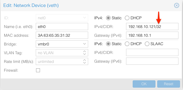 TL;DR When defining networking on Proxmox 4 LXC containers, use an appropriate CIDR suffix (e.g. 24) - don’t use 32!