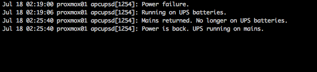 Jul 18 02:19:00 proxmox01 apcupsd[1254]: Power failure.