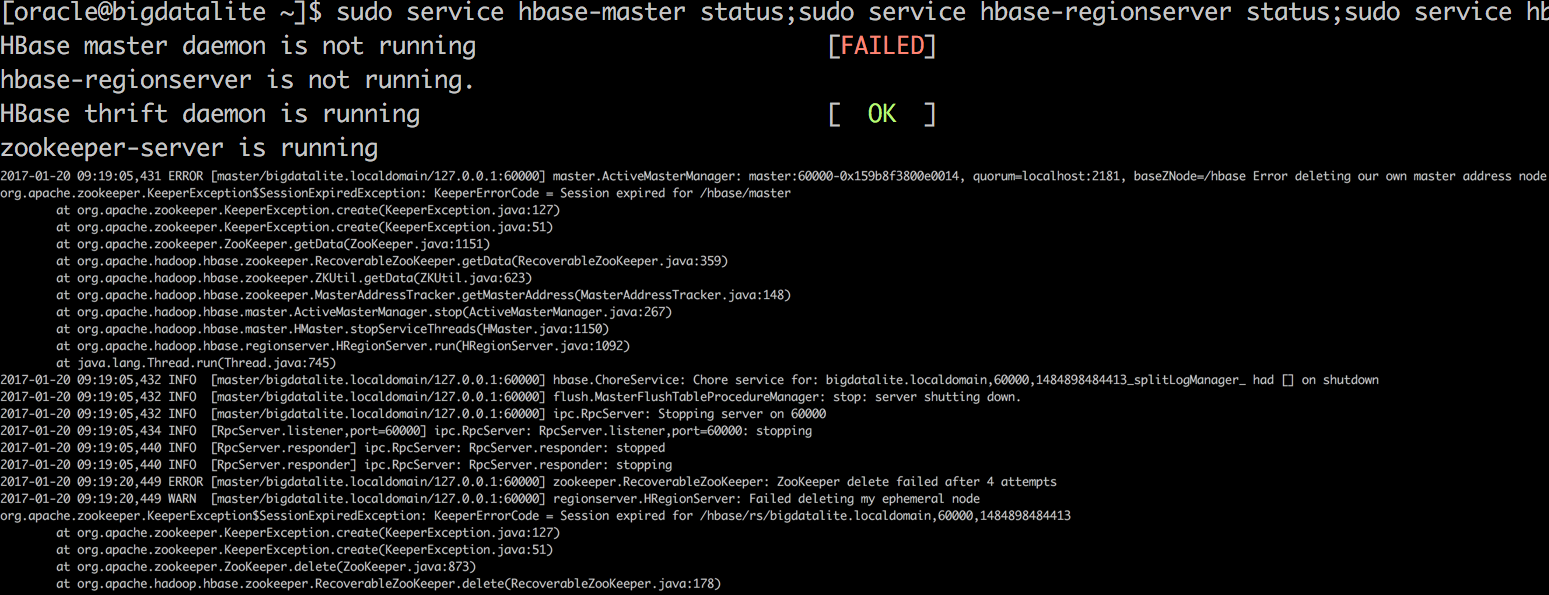 2017-01-20 09:19:05,430 ERROR [master/bigdatalite.localdomain/127.0.0.1:60000] zookeeper.ZooKeeperWatcher: master:60000-0x159b8f3800e0014, quorum=localhost:2181, baseZNode=/hbase Received unexpected KeeperException, re-throwing exception