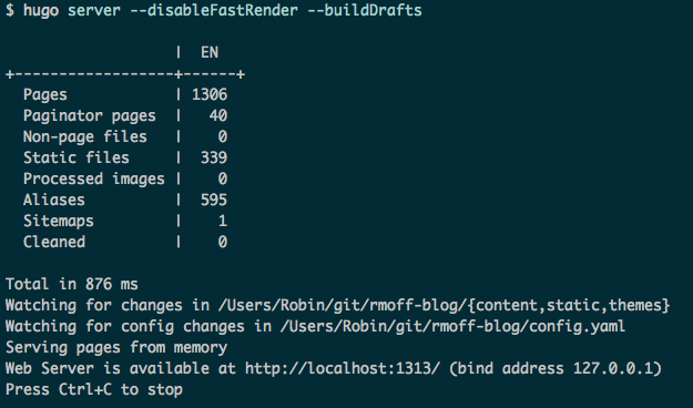 Hugo is one of the breed of blog platforms that works by generating static HTML, which makes it simple (fewer moving parts, no database backend, etc) and nice and fast. Because it just generates HTML you can host the contents on Github Pages (bye bye AWS hosting costs), and because it is just static HTML one can worry less about falling behind in versions. After all, Github are doing the actual hosting and can worry about securing the server; my only bit is the static HTML, and who cares if it’s generated by an older version of code?