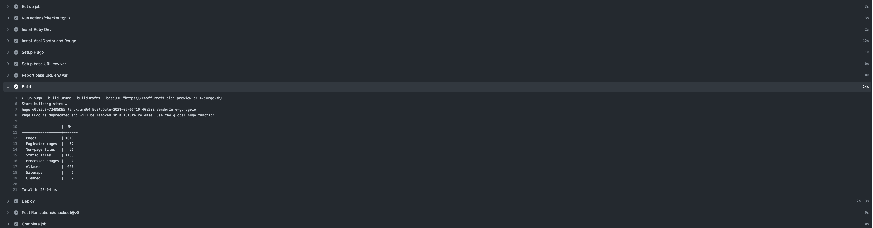 In essence it’s the same as deploying the production Hugo site to GitHub Pages, except it’s hosted on https://surge.sh/ instead and with a variable URL (since you might have multiple drafts each with their own PR).