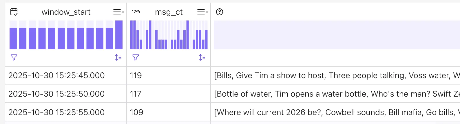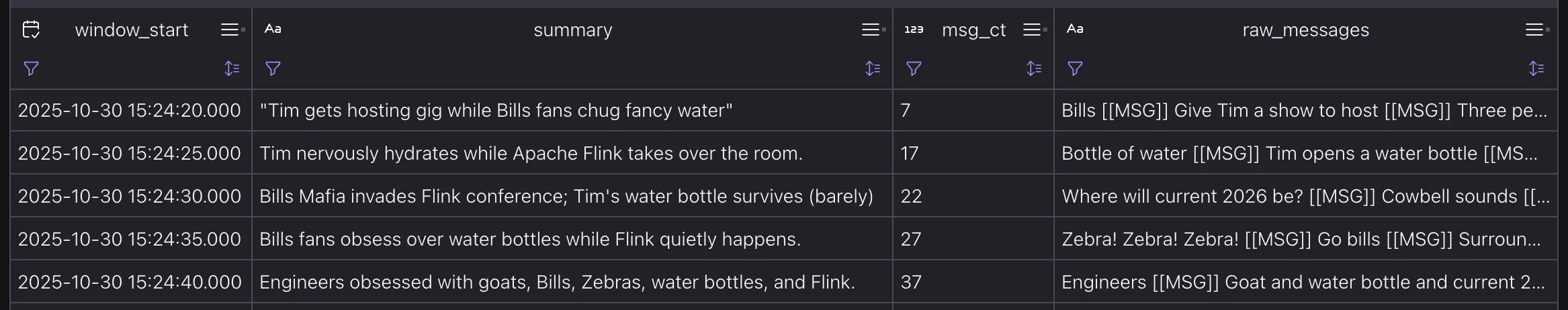So, I wrapped a CREATE TABLE…AS SELECT around the above query above that reads a window of messages from user_messages and calls AI_COMPLETE(), giving us a new Flink table to use as the source for a second model: