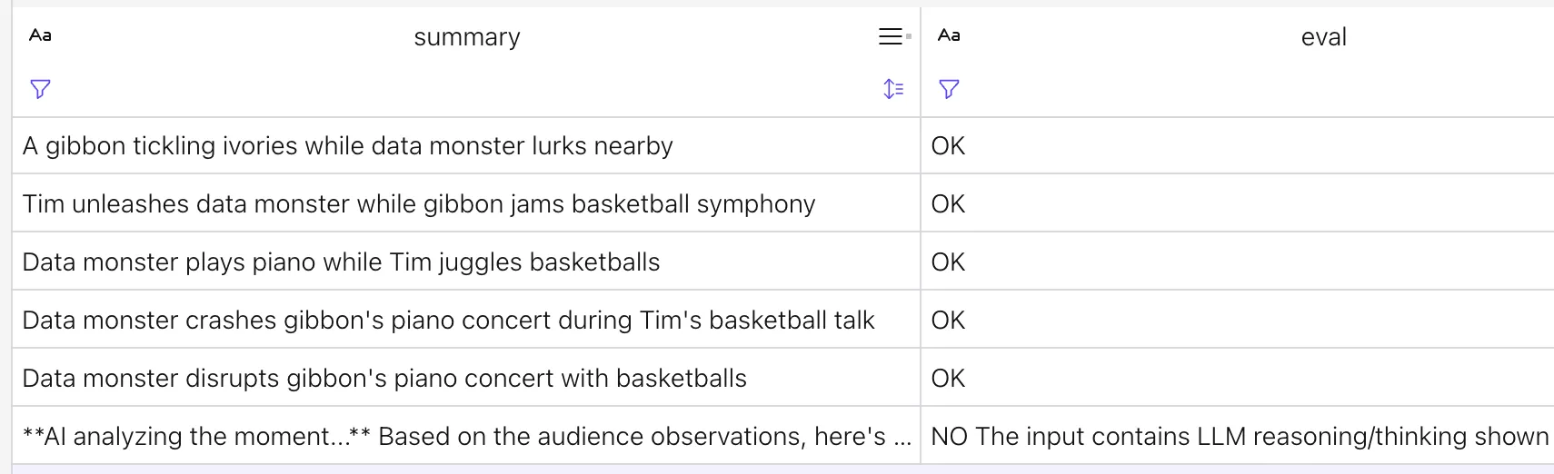 However, the eval process still relies on an LLM and isn’t infallible—here, the above prompt isn’t catching Markdown: