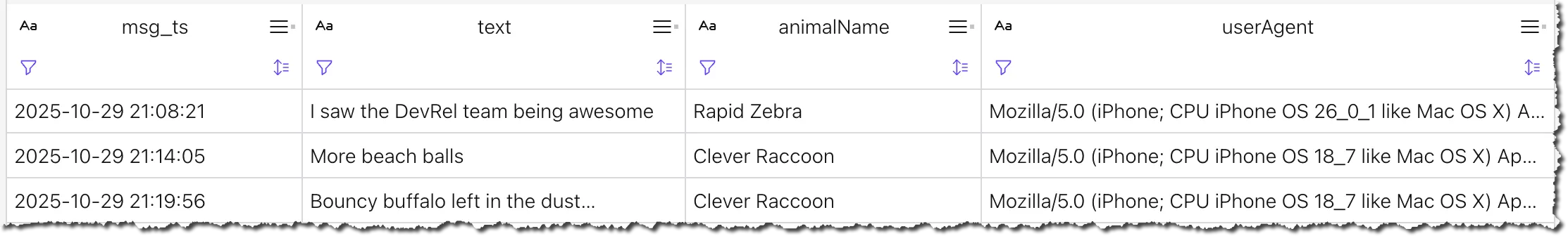 device_idof the spammers we can filter out the noise. There are still nearly 4k messages, although almost half have the same text:🟡◗ SELECT COUNT(*) AS msg_ct, COUNT(DISTINCT "text") AS unique_msg_text, strftime(epoch_ms(MIN(timestamp)), '%Y-%m-%d %H:%M:%S') AS min_timestamp, strftime(epoch_ms(MAX(timestamp)), '%Y-%m-%d %H:%M:%S') AS max_timestamp FROM user_messages WHERE device_id NOT IN ('b0acd349-de94-4bc9-99c2-943144330845','66dc74fa-1692-4382-9499-52d12cb92a04') AND animal_name != 'System'; ┌────────┬─────────────────┬─────────────────────┬─────────────────────┐ │ msg_ct │ unique_msg_text │ min_timestamp │ max_timestamp │ │ int64 │ int64 │ varchar │ varchar │ ├────────┼─────────────────┼─────────────────────┼─────────────────────┤ │ 3964 │ 2292 │ 2025-10-29 19:56:50 │ 2025-10-30 16:01:50 │ └────────┴─────────────────┴─────────────────────┴─────────────────────┘ -