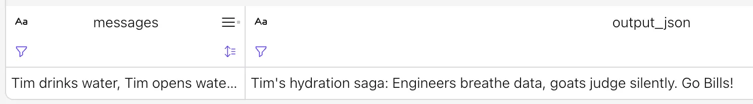 So, I wrapped a CREATE TABLE…AS SELECT around the above query above that reads a window of messages from user_messages and calls AI_COMPLETE(), giving us a new Flink table to use as the source for a second model: